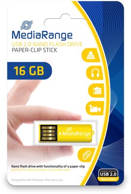 MediaRange USB nano flash drive, paper-clip stick, yellow, 16GB