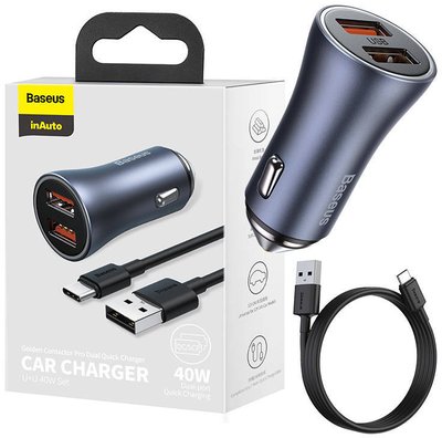 Ładowarka samochodowa Baseus Golden Contactor Pro, 2x USB, 40W (szara) + kabel USB do USB-C 1m (czarny)