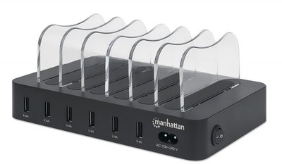 Manhattan Charging Station, 6x USB-A Ports, Outputs: 6x 2.4A, Smart IC, LED Indicator Lights, Black, Three Year Warranty