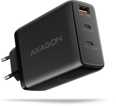 AXAGON ACU-DPQ100 GaN Wall charger, 3x port (USB + dual USB-C), PD3.0/QC4+/PPS/Apple, 100W, black