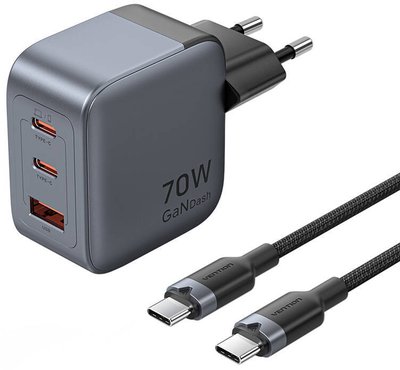 GaN Vention USB-C+C+A 70W Charger + USB-C-C Cable 1m (Gray)